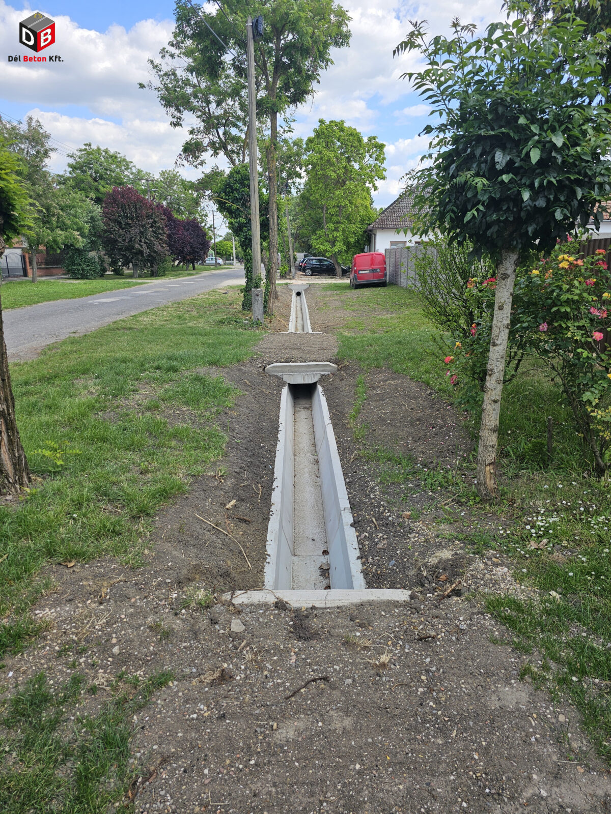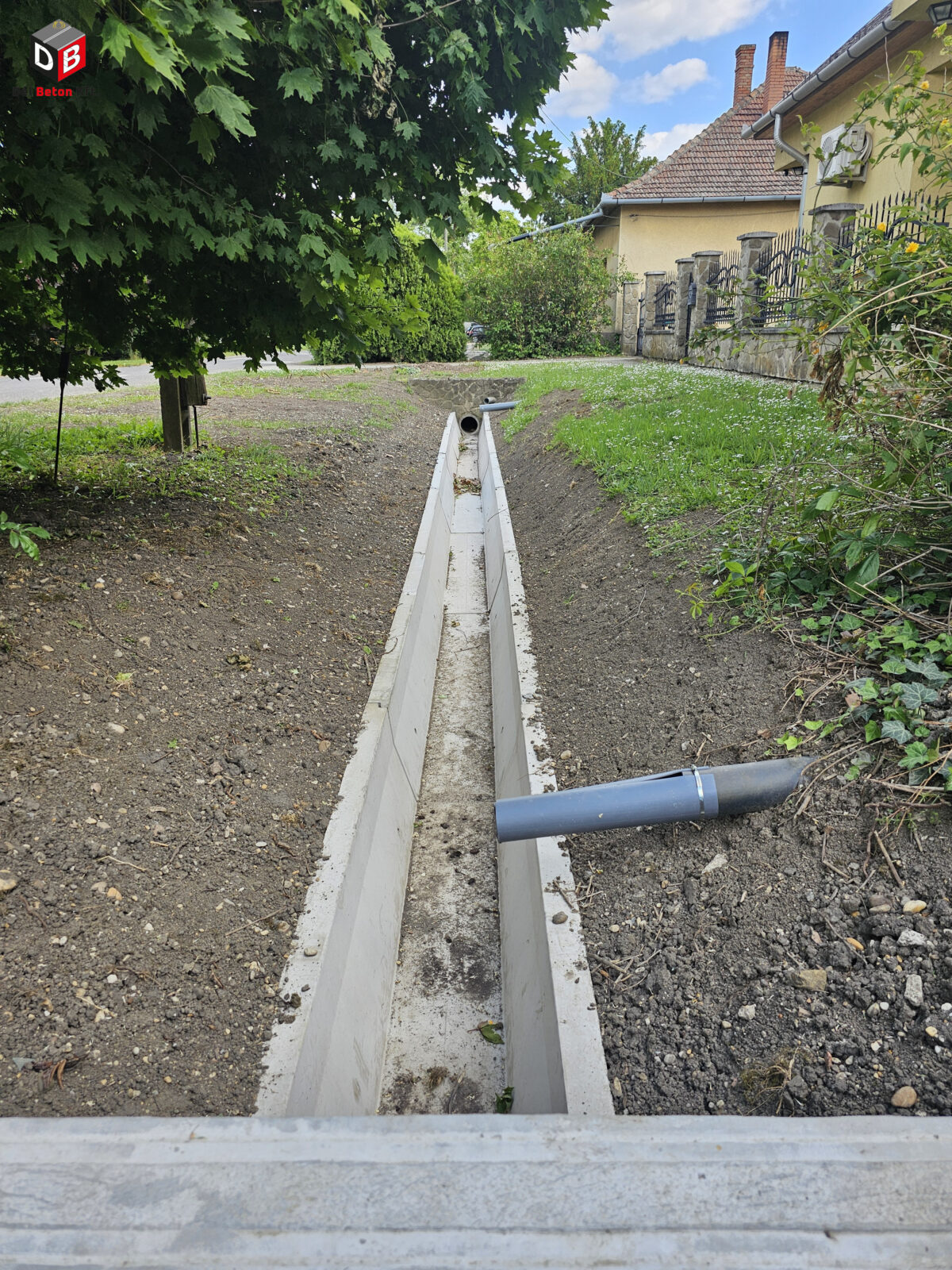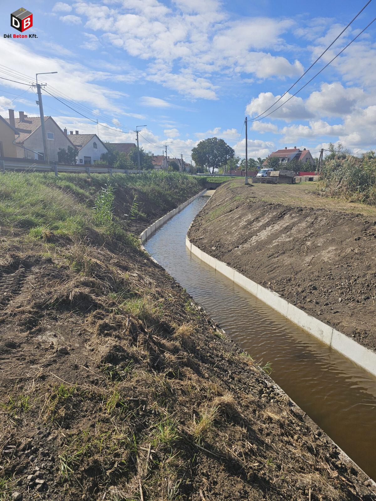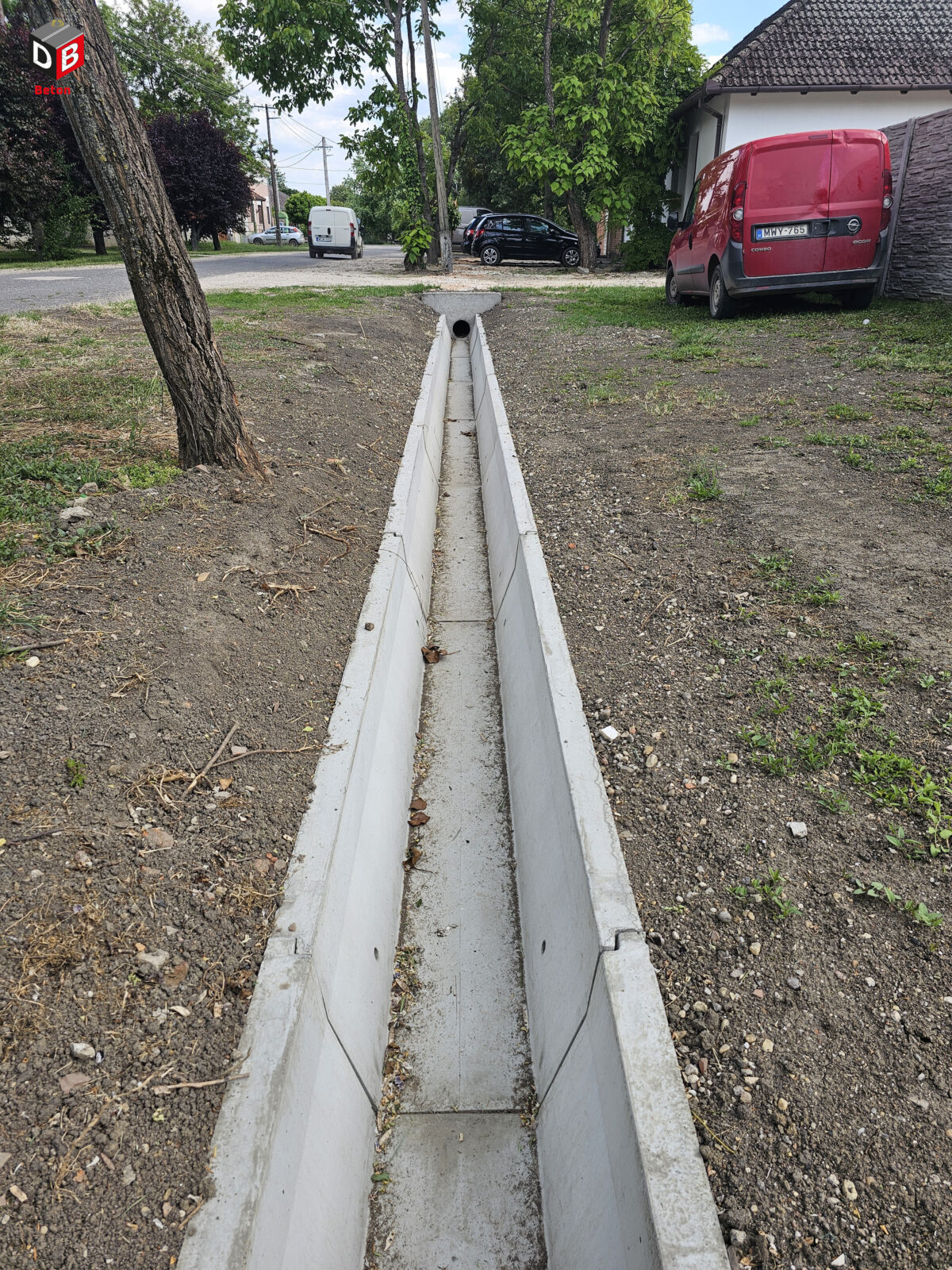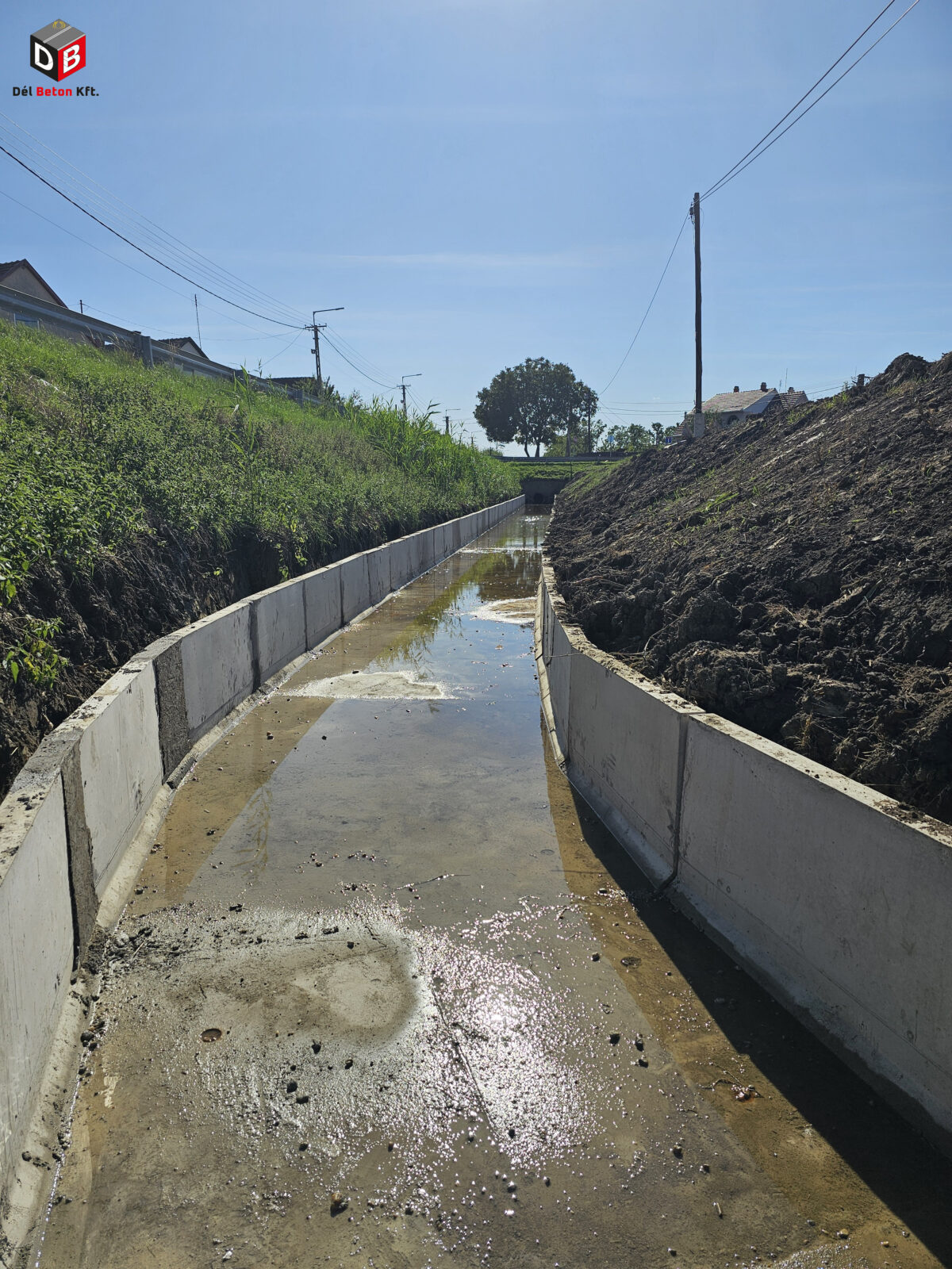 400fm hosszban épült be BM30/50/40 bordás mederburkoló elem, melyekre a kapubejárókban teherbíró fedlapok kerültek elhelyezésre.