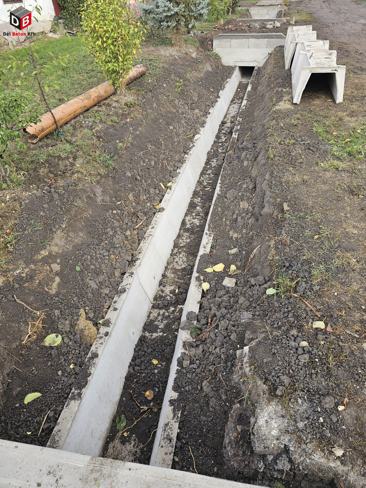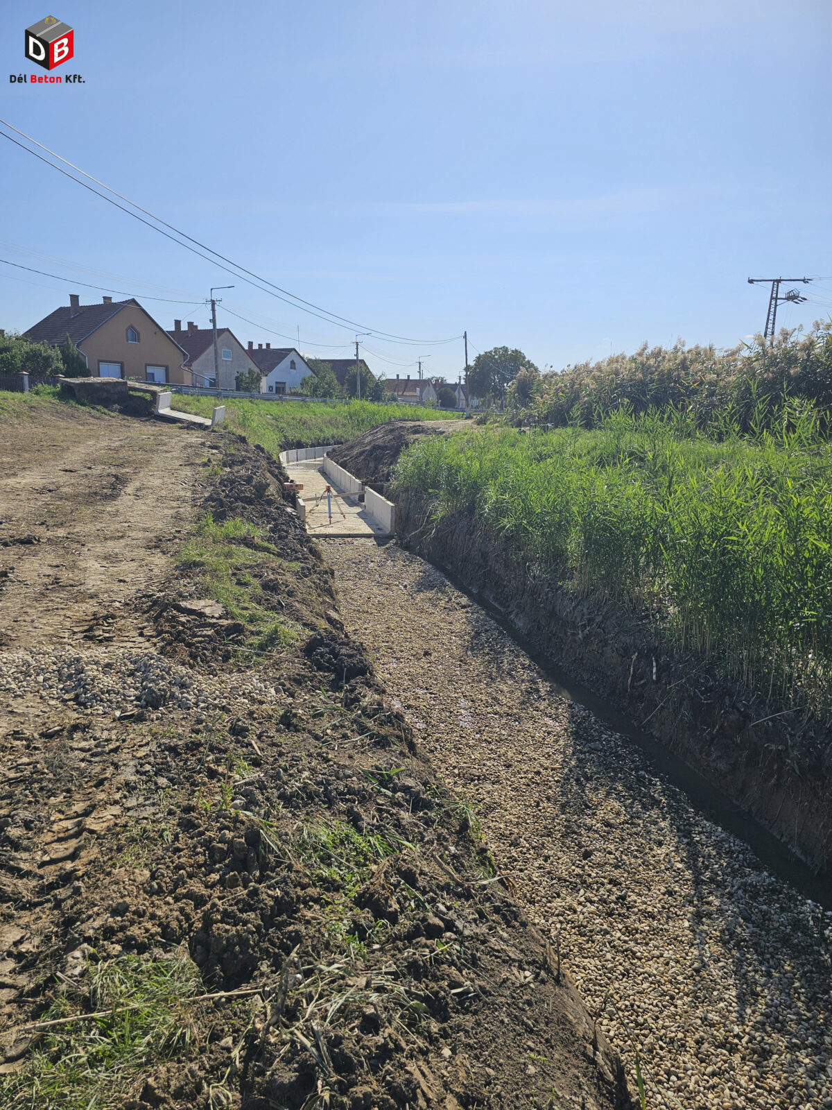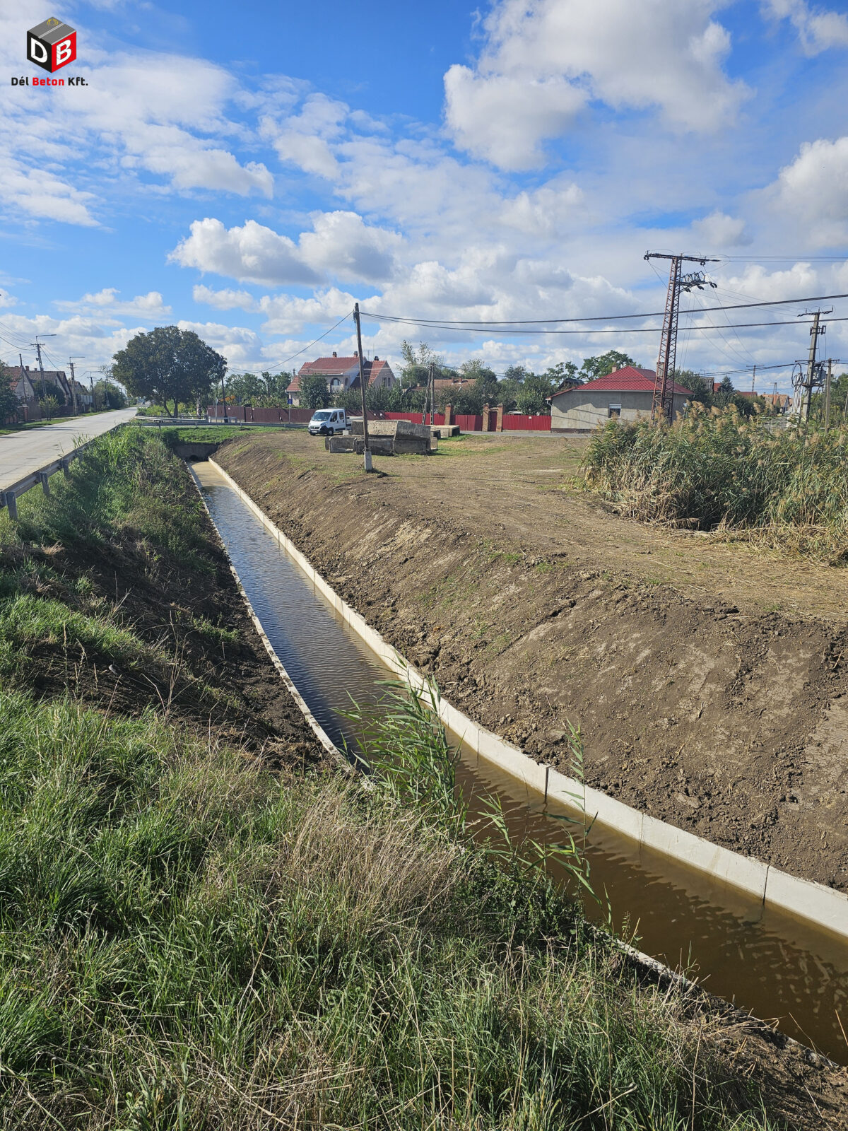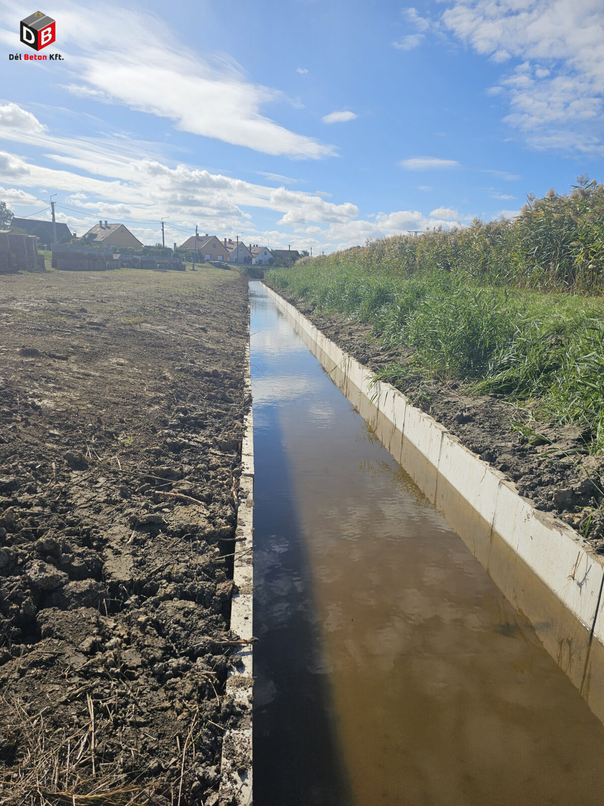 400fm hosszban épült be BM30/50/40 bordás mederburkoló elem, melyekre a kapubejárókban teherbíró fedlapok kerültek elhelyezésre.
