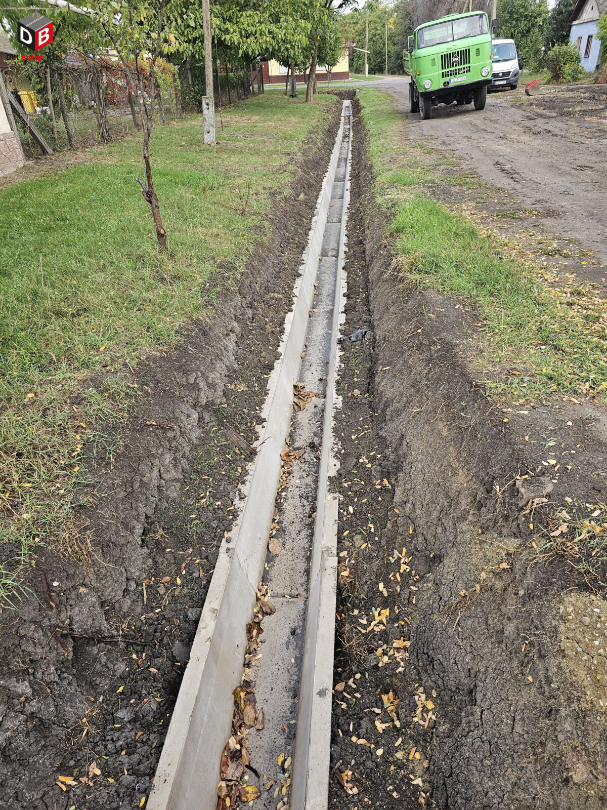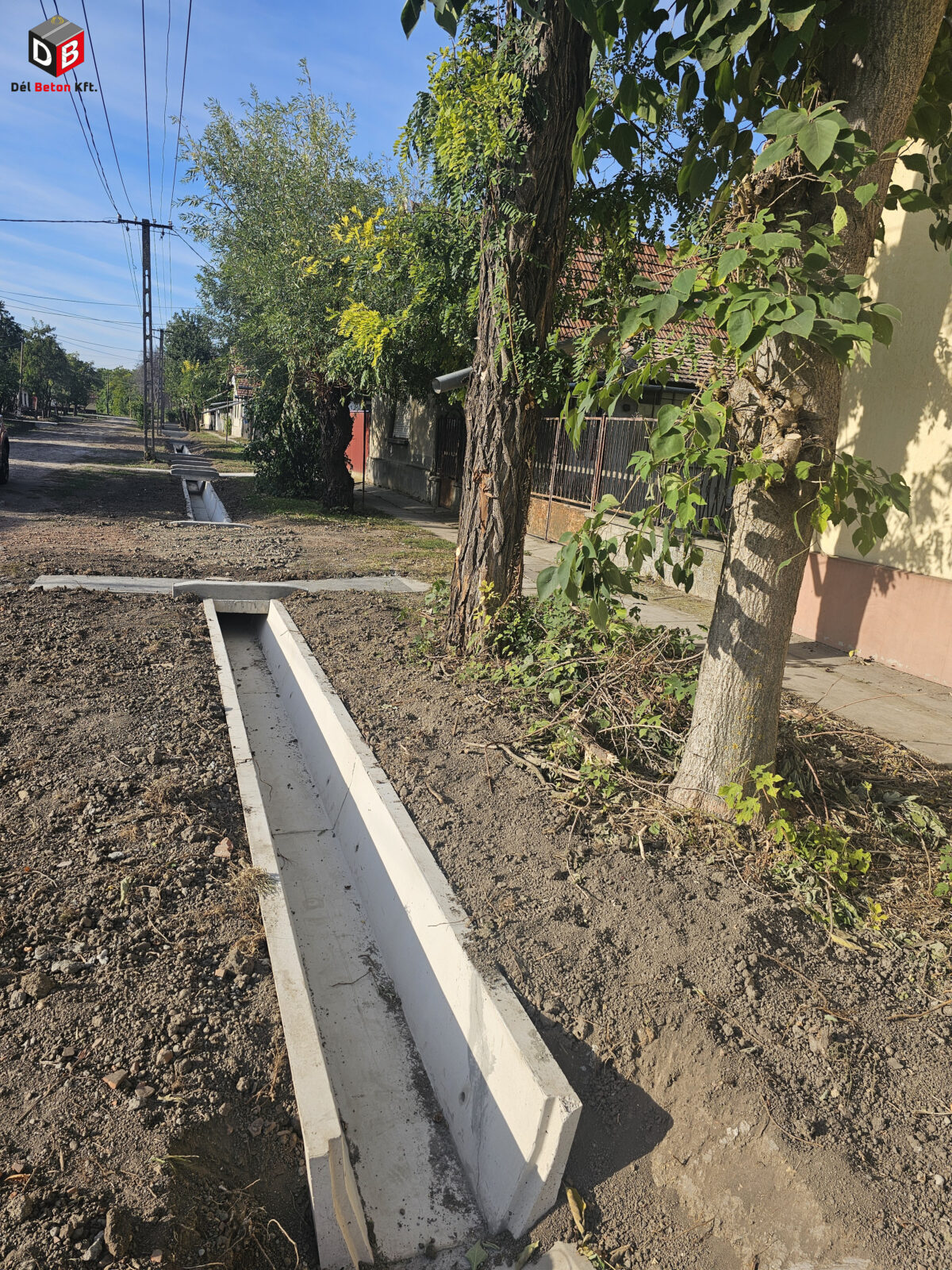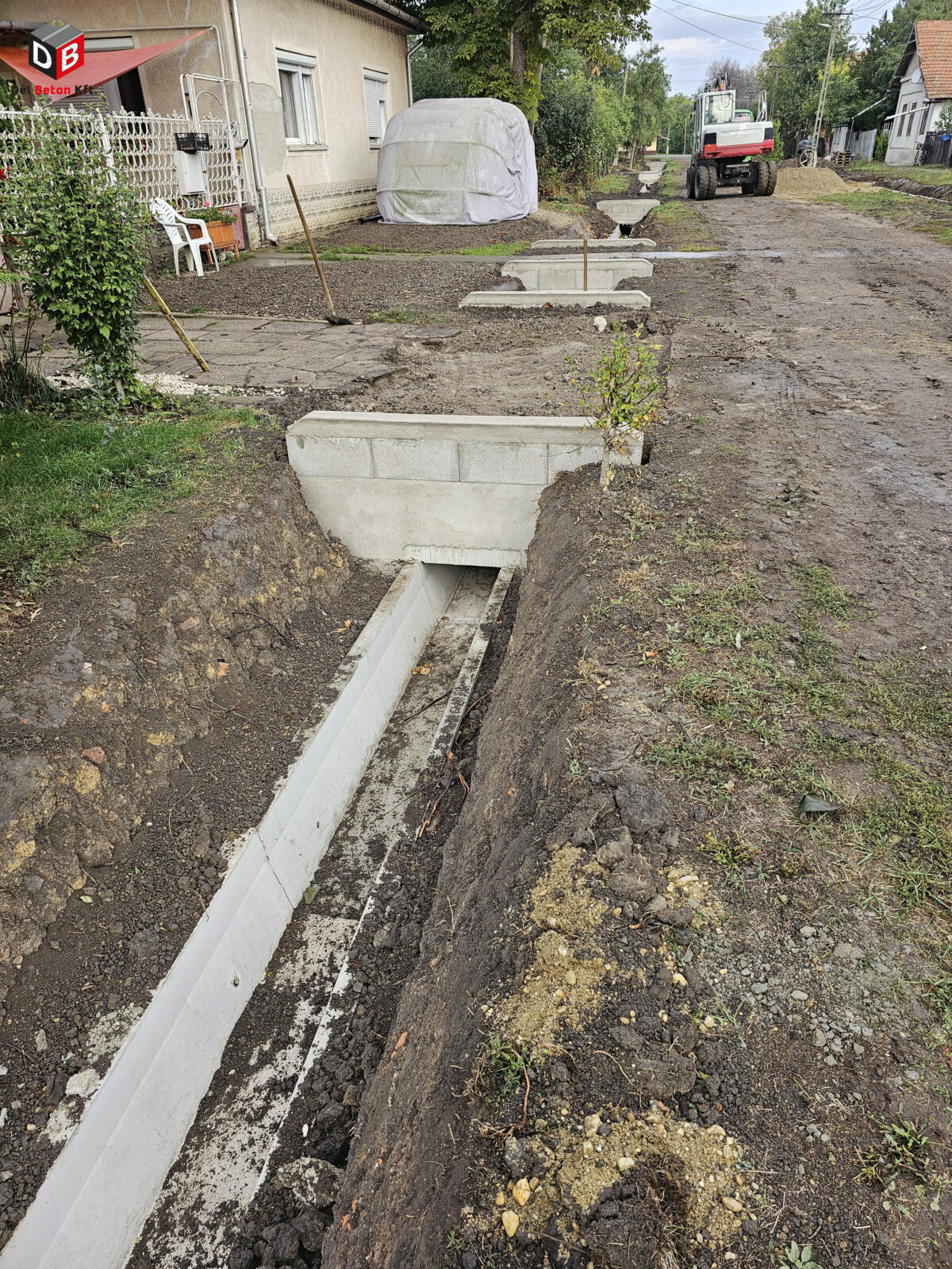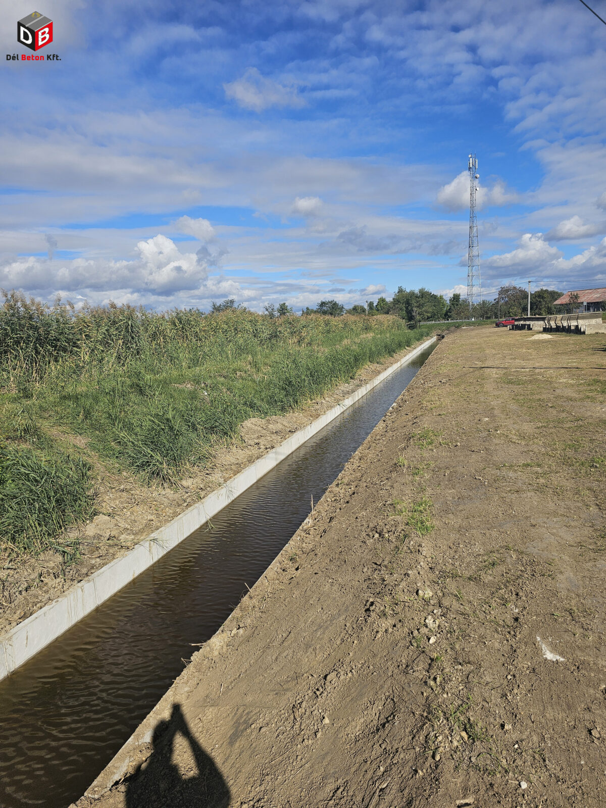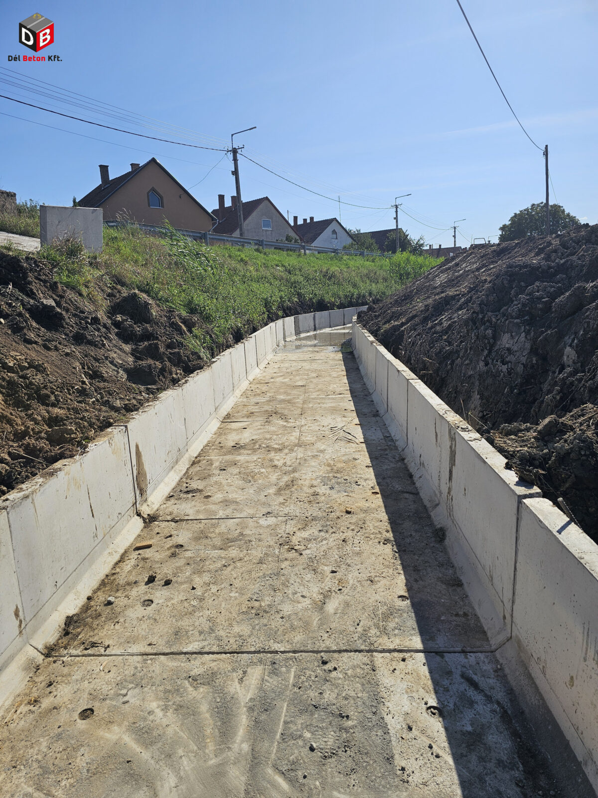 400fm hosszban épült be BM30/50/40 bordás mederburkoló elem, melyekre a kapubejárókban teherbíró fedlapok kerültek elhelyezésre.